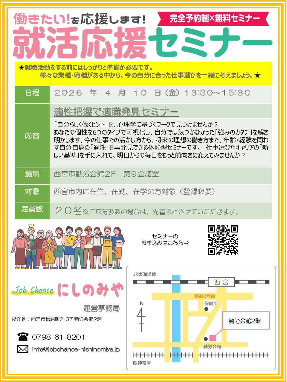 | 内容 | 【適性把握で適職発見】セミナー 「自分らしく働くヒント」を、心理学に基づくワークで見つけませんか? あなたの個性を6つのタイプで可視化し、自分では気づかなかった「強みのカタチ」を解き明かします。今の仕事での活かし方から、将来の理想の働き方まで、年齢・経験を問わず自分自身の「適性」を再発見できる体験型セミナーです。 仕事選びやキャリアの「新しい基準」を手に入れて、明日からの毎日をもっと前向きに変えてみませんか? |